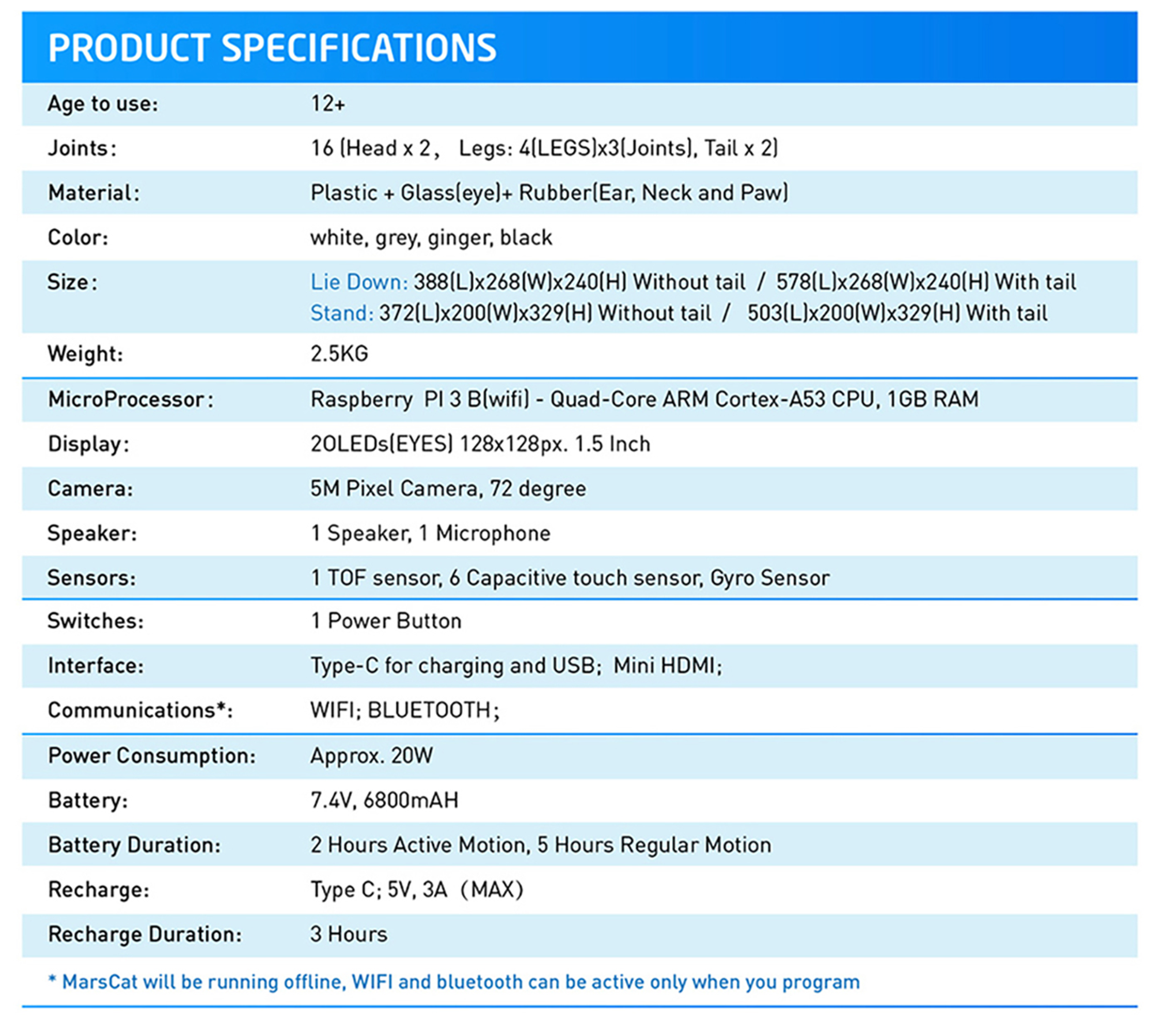 It is fully responsive and has sensitive interactions. It can feel your touch, hear your voice, see your face and play with toys. Every MarsCat is unique from its eyes, body to personality, its personality will change according to the way you pet it. With powerful quad-core Raspberry PI, you can also program it easily and give it endless possibilities.